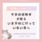 2024-09-02 / 最終更新日時 : 2024-09-02 nakamura 不登校 いま学校に行っていない君へ 7/28(日)に埼玉県教育主催で開催された「不登校の子供を支えるためのセミナー」内のパネルディスカッションにて、不登校を経験し、その後不登校を克服したパネラーが貴重な言葉を伝えていました。メモしたものをまとめて書き記した […]